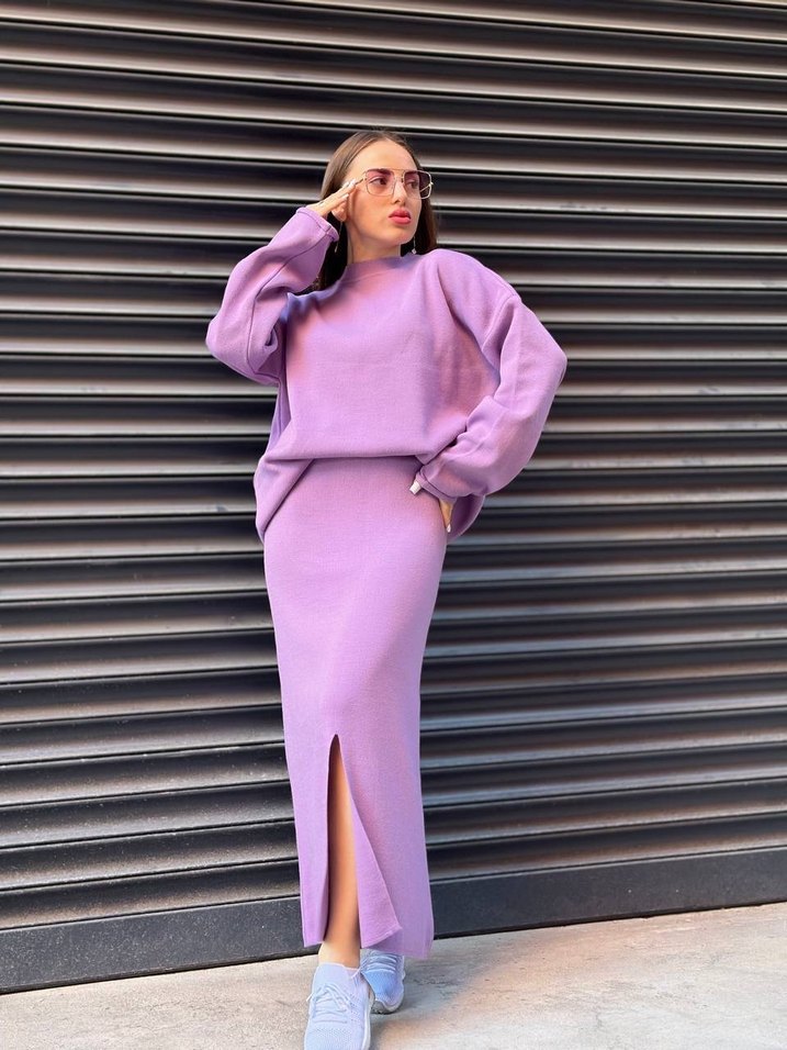 Uzun mor triko etekli takım , yuvarlak yaka ve uzun kollu, rahat kesimli ve yumuşak, sıcak kumaştan üretilmiştir. Önünde şık bir yırtmaç bulunur, gündelik sokak tarzı için uygundur.
