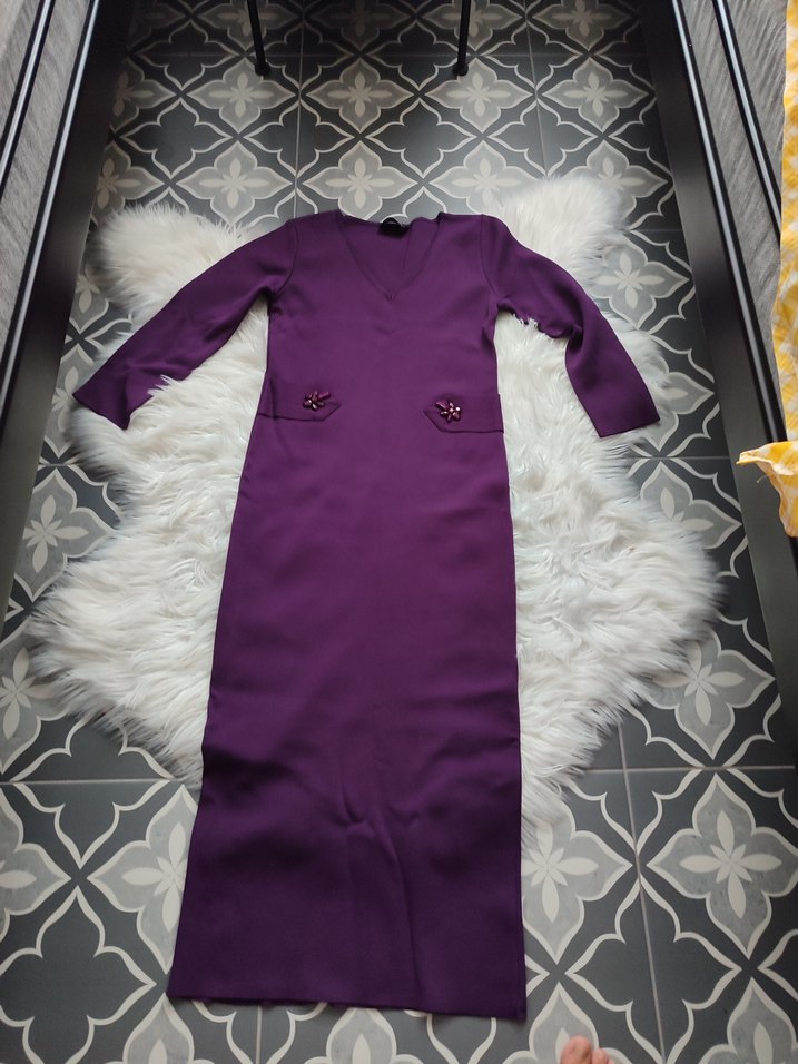 V yaka, uzun kollu ve triko kumaştan yapılmış mor, uzun ve vücuda oturan kadın elbisesi. zarif detaylar bulunur.dar kalıptır