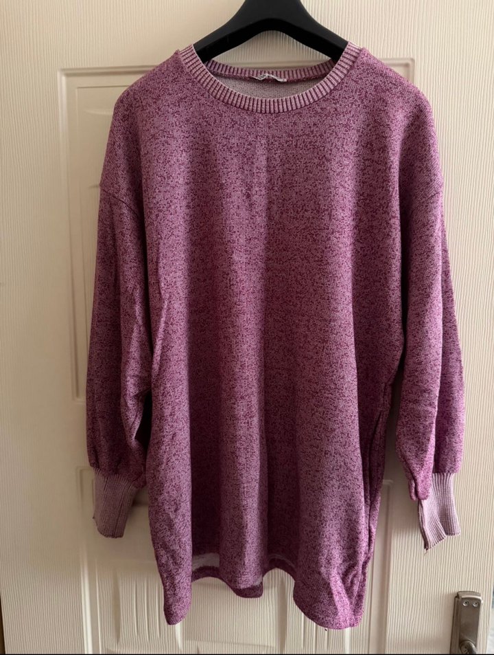 Mor renkli, uzun kollu, yuvarlak yaka, örme kumaştan yapılmış, bol kesim kadın kazak. Günlük kullanıma uygun sade tasarım