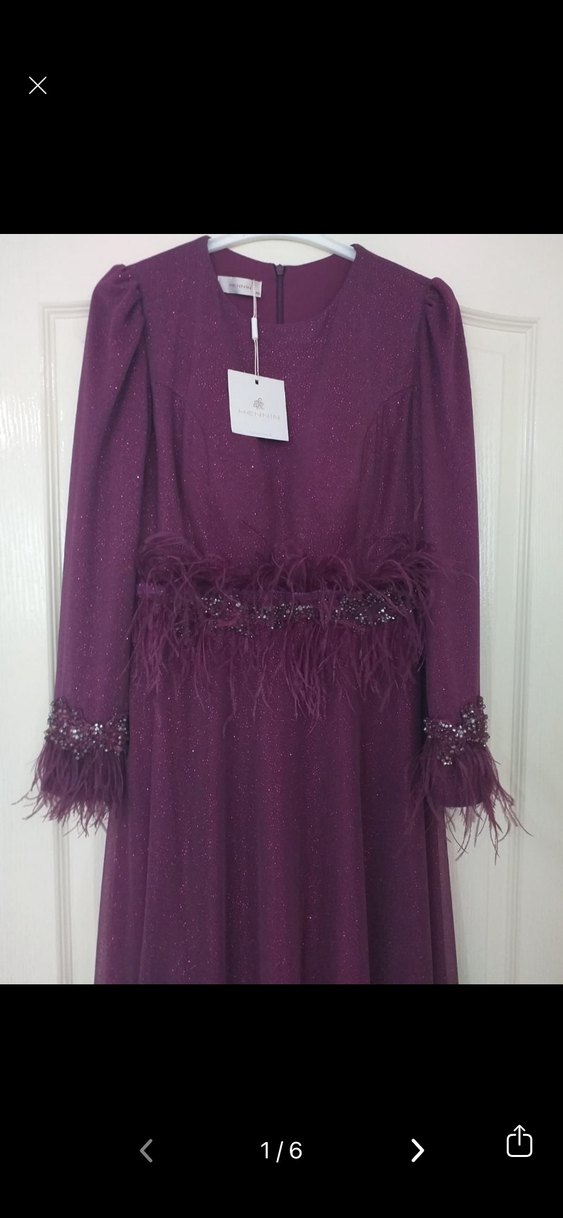 Uzun kollu, bisiklet yaka ve bol kesim mor abiye elbise. Bel ve manşetlerde tüy detayları ve hafif desenli kumaş bulunur. Düğün için modern klasik tarzda uygun.