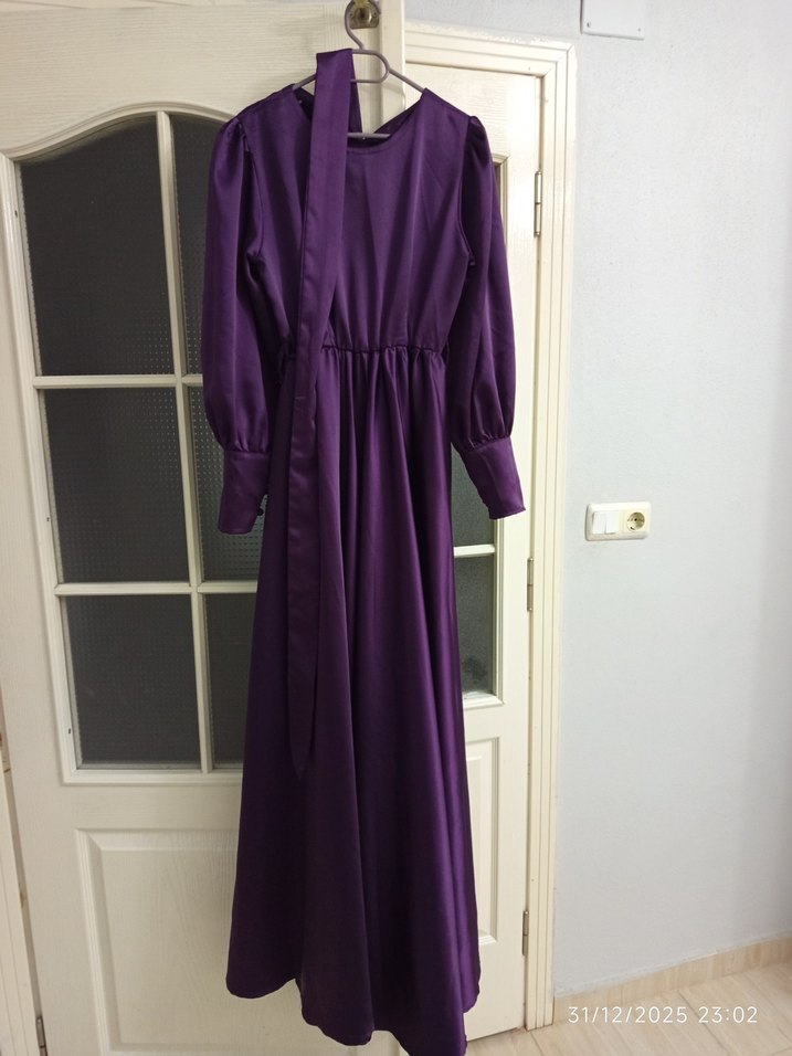 Mor uzun kollu ve yüksek yakalı, dökümlü saten kumaştan yapılmış bol kesim uzun elbisedir. kemerli elbise