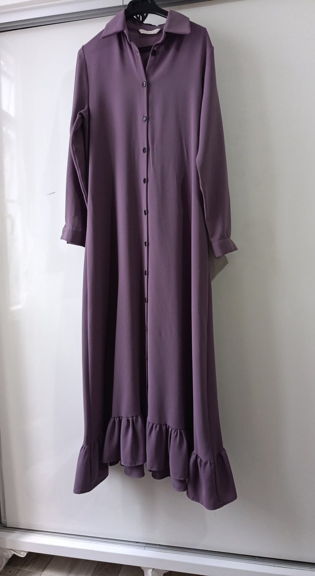 Bu bol kesim uzun elbise, tekne yaka ve uzun kolludur. Pürüzsüz sentetik kumaştan yapılmış, koyu mor renkte ve etek ucunda fırfır detayları vardır. Günlük kullanıma uygundur.