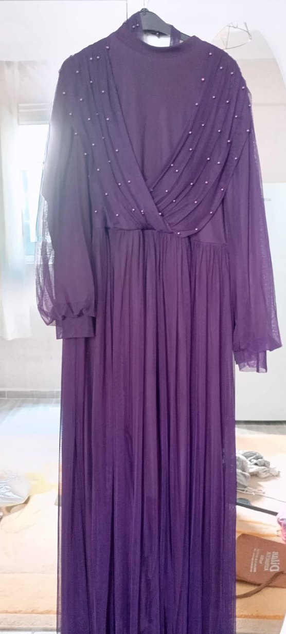 Mor renkte, drapeli ve bol kesim uzun kollu abiye elbise. Parlak yüzeyi ve V yakasıyla düğün ve özel günlere uygundur. ✨