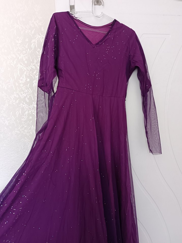 Mor renkli, uzun kollu, V yaka ve dökümlü tasarıma sahip uzun kadın abiye elbisesi. Düğünler için klasik şıklık ve parlak dokusuyla dikkat çekiyor.