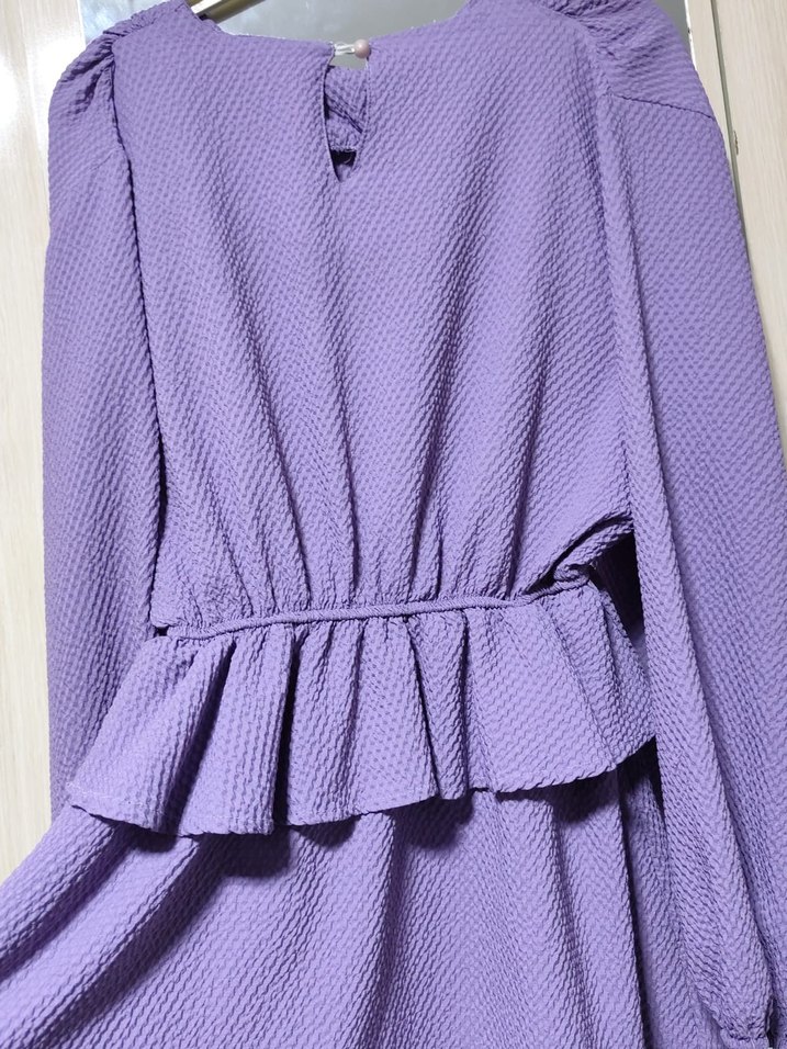 Mor renkli, uzun kollu, V yakalı ve bol kesimli kadın elbisesi. Bel kısmında fırfır detayları bulunur ve yumuşak sentetik kumaştan üretilmiştir.