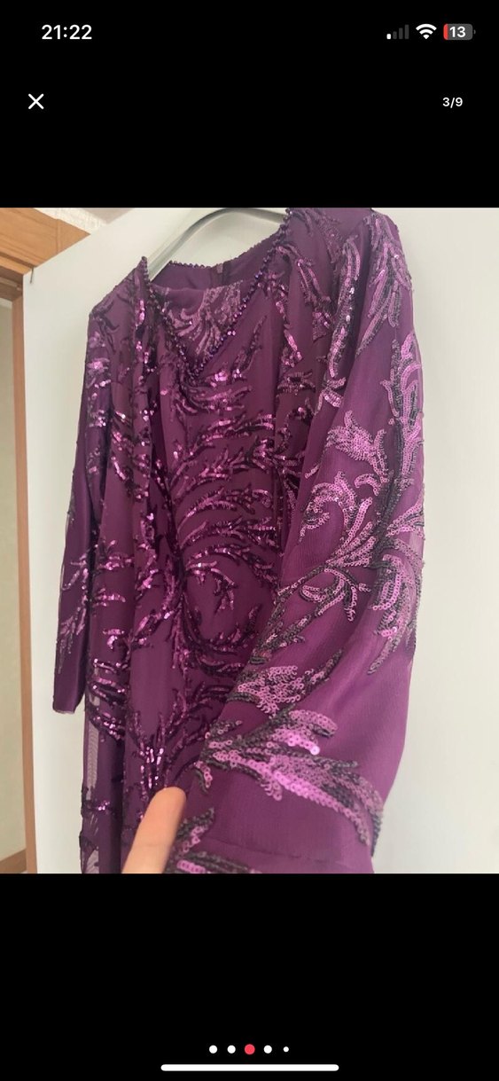 Kadınlar için mor, uzun kollu, V yakalı, bol kesim ve drapeli Hint elbisesi. Desenli payet detaylarıyla düğünler için şık ve göz alıcı bir seçim. ✨