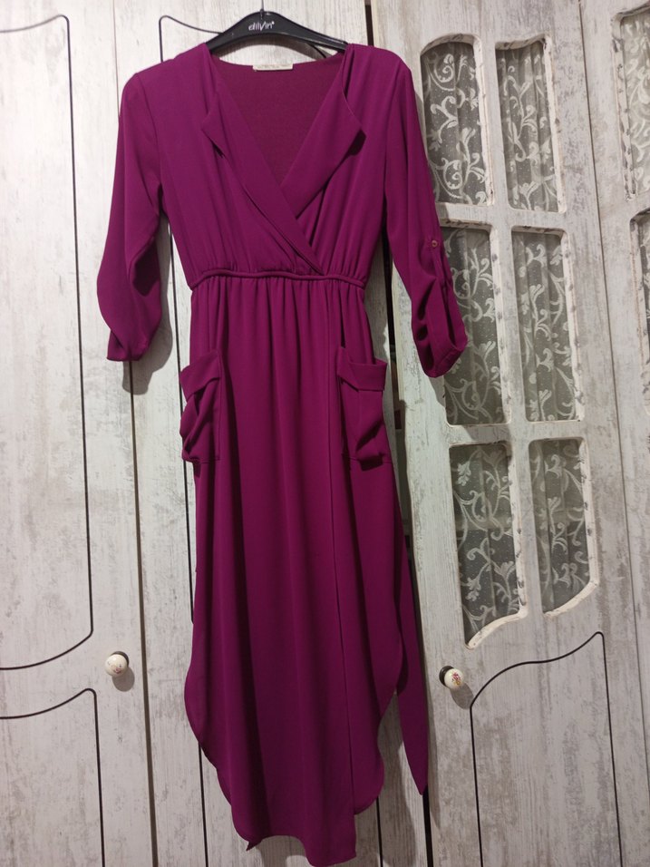 Mor uzun elbise, V yaka ve uzun kollu. Salaş kesim ve drapeli tasarıma sahip, yumuşak sentetik kumaştan üretilmiştir.