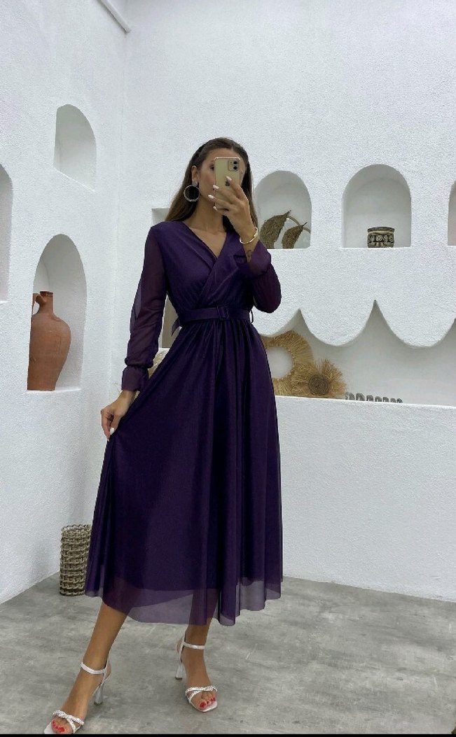 Mor Uzun Kollu V Yaka Simli Kemerli Kadın Elbise