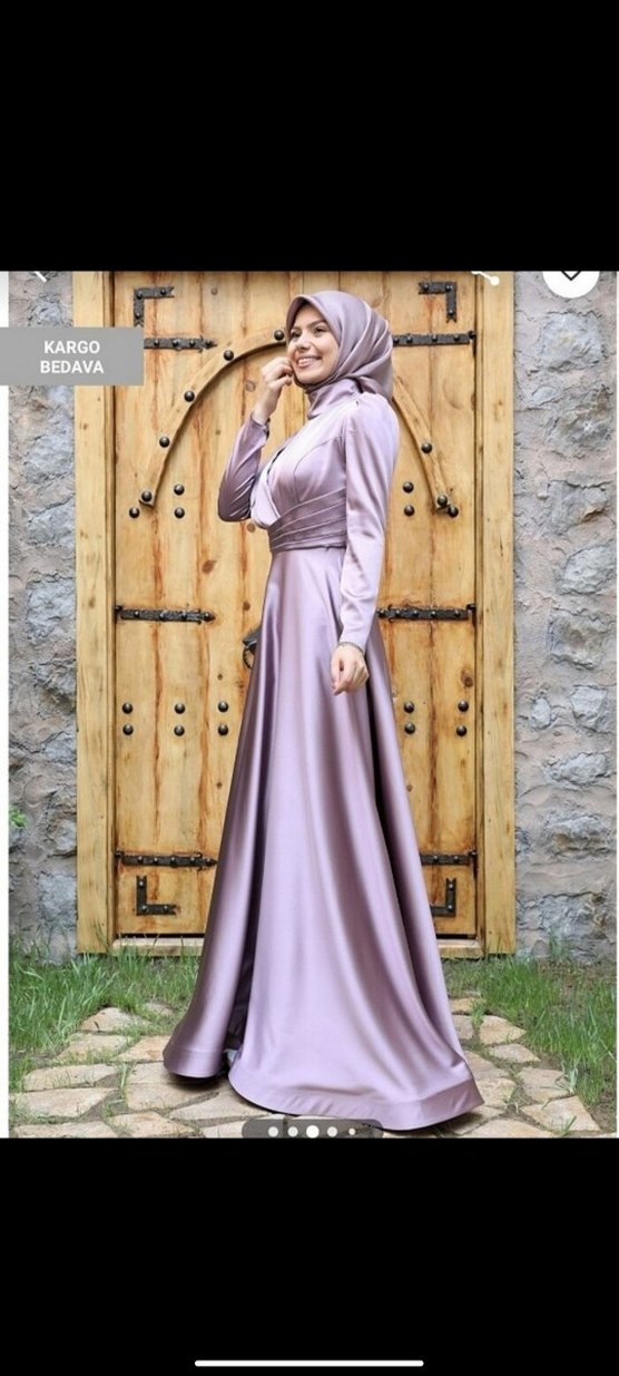 Mor Uzun Kollu V Yaka Uzun Abiye Elbise