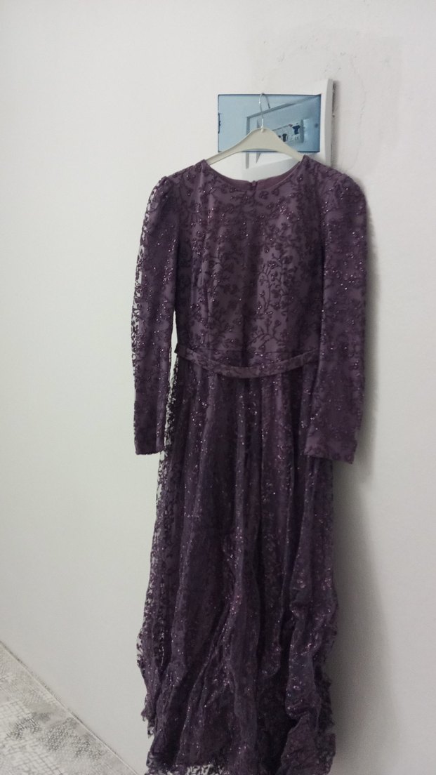 Mor uzun kollu vintage abiye elbise, bol kesim ve drapeli detaylara sahiptir. Klasik yuvarlak yaka ve hafif ışıltılı kumaşıyla düğünler için uygundur.