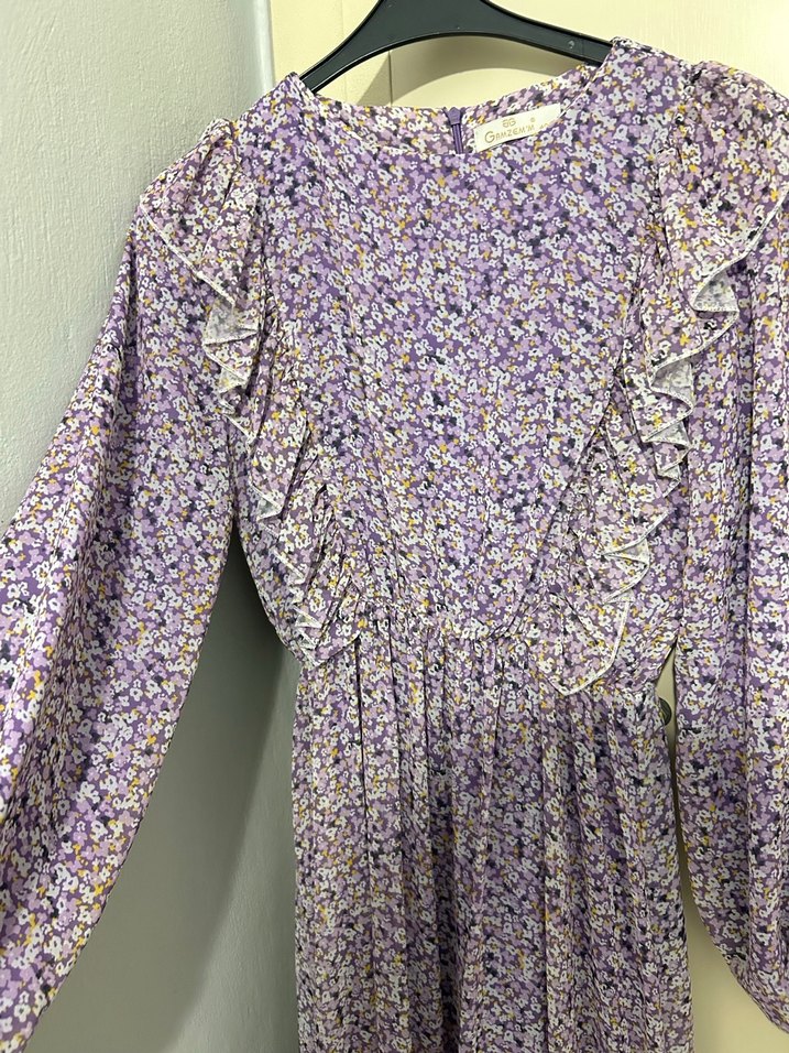 Mor renkli, volan detaylı ve uzun kollu uzun elbise. Rahat kesimi ve V yaka tasarımı ile yumuşak sentetik kumaştan yapılmıştır.