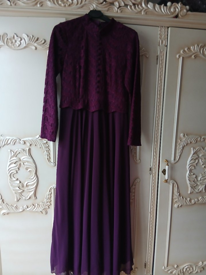 Koyu mor renkte, uzun kollu, yüksek yakalı ve bol kesim kadın elbisesi. Örgü kumaştan, drapeli ve desensiz tasarımıyla gotik tarzda düğünler için uygundur.