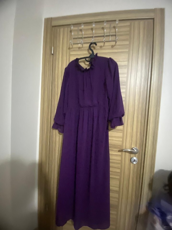 Mor renkte, yüksek yakalı ve uzun kollu, ipeksi kumaştan yapılmış salaş ve drapeli uzun elbise. Vintage ve bohem tarzlar için uygundur, düğünlerde tercih edilebilir.