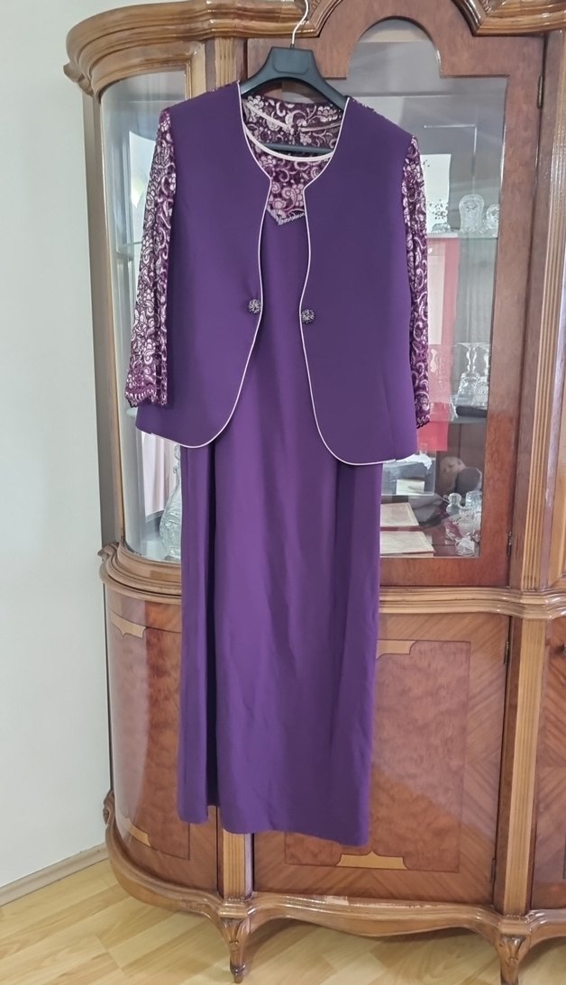 Mor renkli, kolsuz, notched lapel yakalı ve drapeli detaylı uzun elbise. Sentetik kumaştan, ofis için uygun klasik ve sade tasarım.