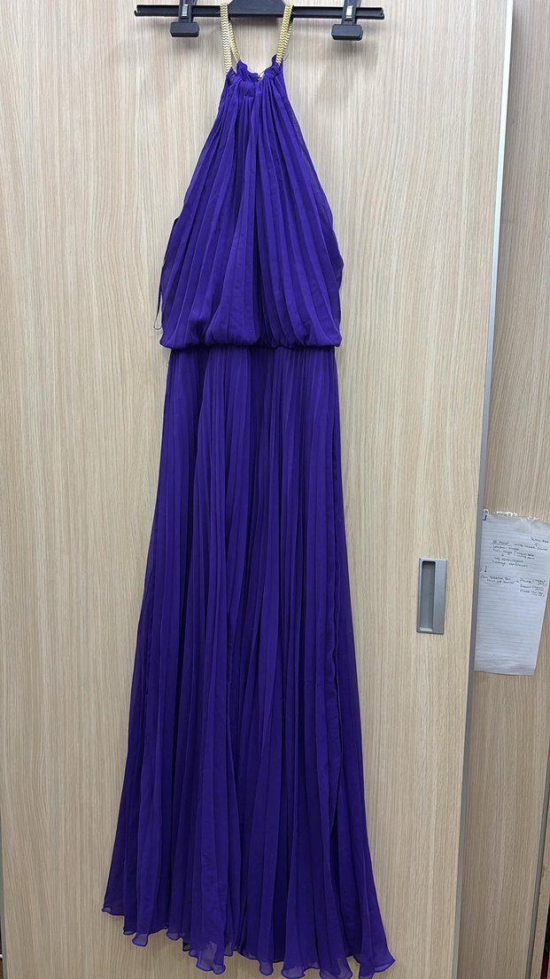 Mor uzun pilili elbise, ipeksi dokuda, askılı ve yüksek yakalıdır. Düğün gibi özel etkinlikler için uygun, vücuda oturan kesime sahiptir. omuzlar sarı zincirle birlesiyor