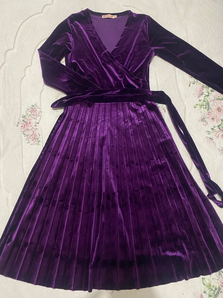 Bu mor uzun elbise, pilili etek ve V yaka detayına sahip, yumuşak sentetik kumaştan yapılmıştır. Gotik stil ve partiler için uygundur.
