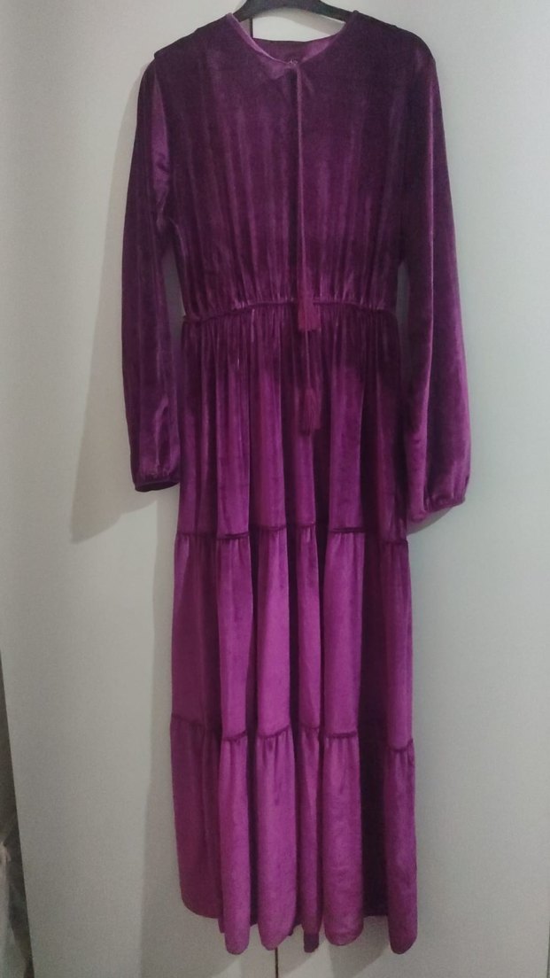 Mor renk, uzun piliseli, bol kesim ve yüksek yakalı elbise. Sentetik kumaştan, bohem tarzda, günlük kullanıma uygun.