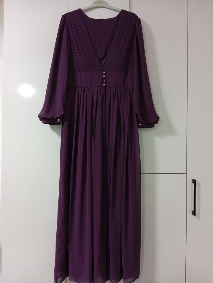 Mor uzun piliseli kadın elbisesi, bol kesim ve şifon kumaştan üretilmiştir. V yaka ve uzun kollu, modern klasik ve vintage tarzı yansıtır. Düğünler için uygundur.