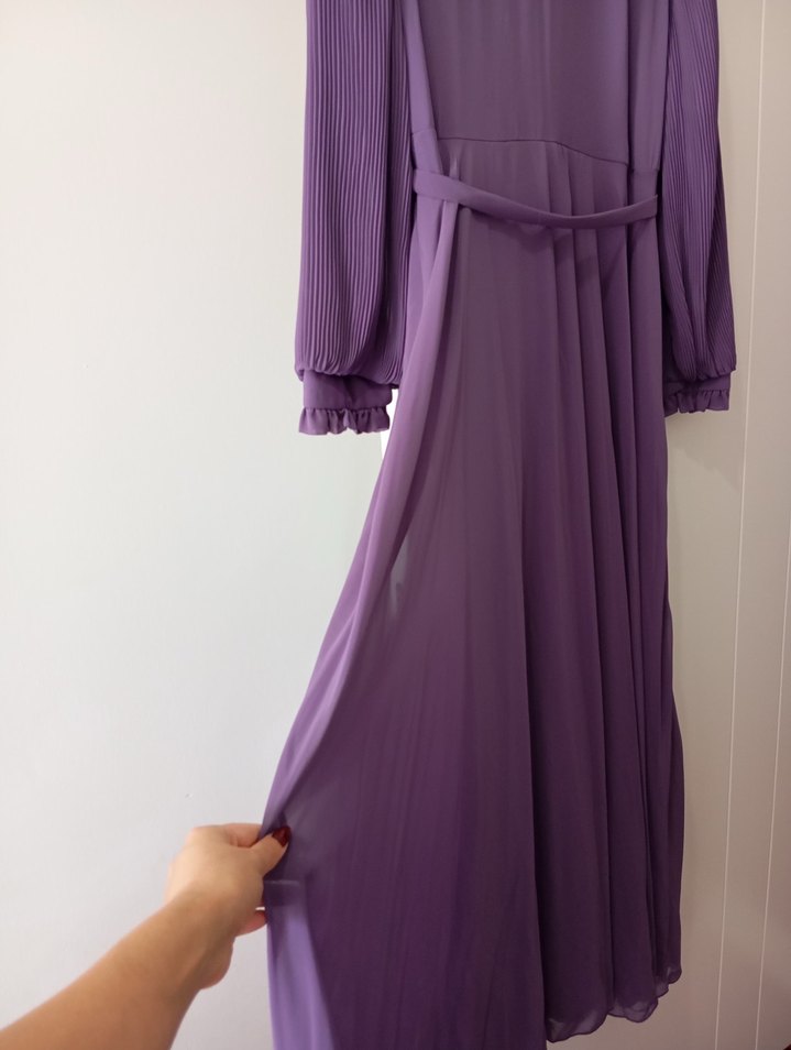 Yüksek yaka ve piliseli uzun kollara sahip, ipeksi kumaştan, bol kesim mor uzun kadın elbisesi. Modern klasik tarzıyla düğün için uygundur.