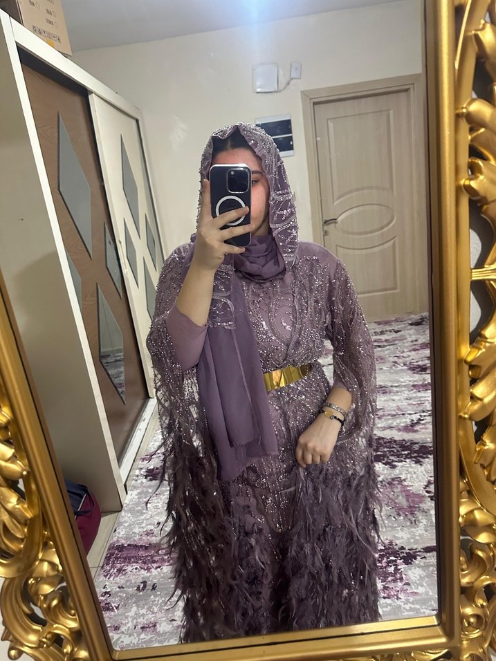 Mor renkte, uzun kollu ve yüksek yakalı salaş kesim bohem abiye elbise. Koyu tie-dye desenli, drapeli ve sade kullanıma uygun. kemer üstünde değildir iade yoktur