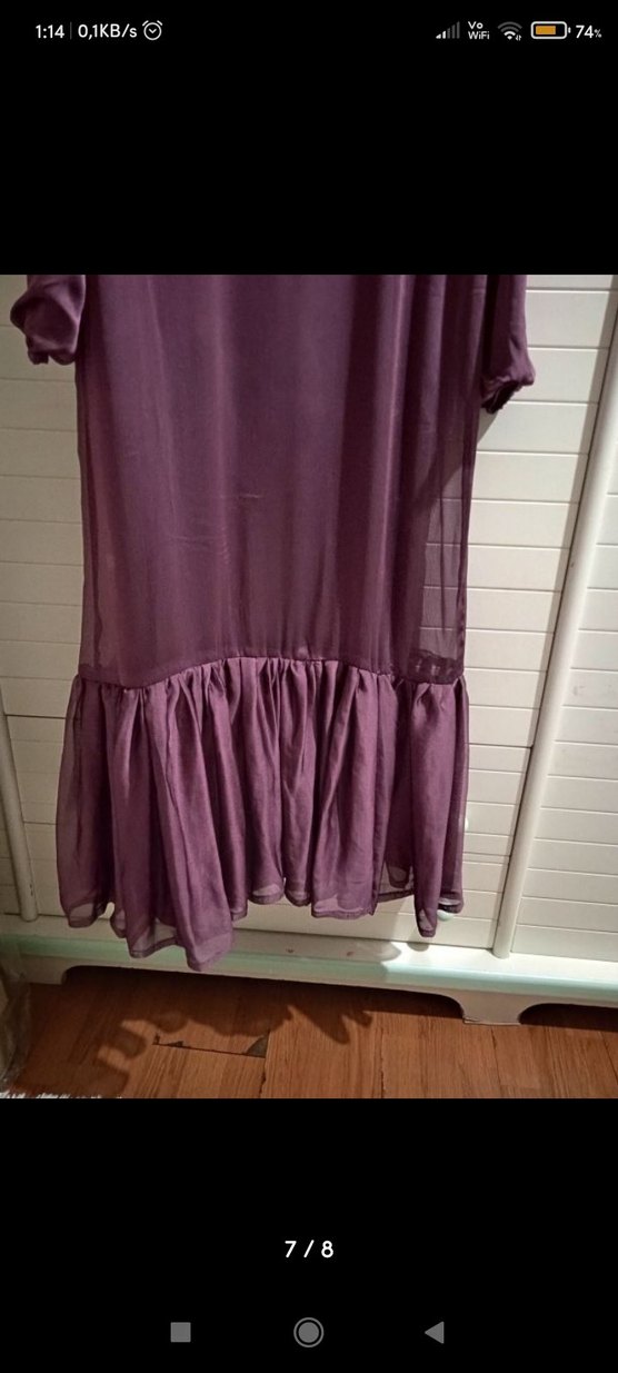 Mor renkte, uzun ve salaş kesim elbise. Fırfırlı etek ucu, bisiklet yaka ve uzun kolludur. İpeksi kumaştan, bohem tarz için uygun. iki kol arası 63cm, boy 133c m