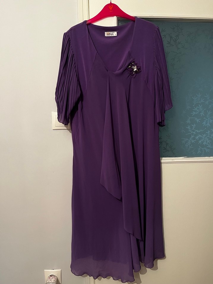 Mor renkte, uzun ve salaş kesimli abiye elbise. Notlu yaka ve pileli kısa kollara sahip, drapeli tasarımıyla düğün gibi özel anlara uygun.