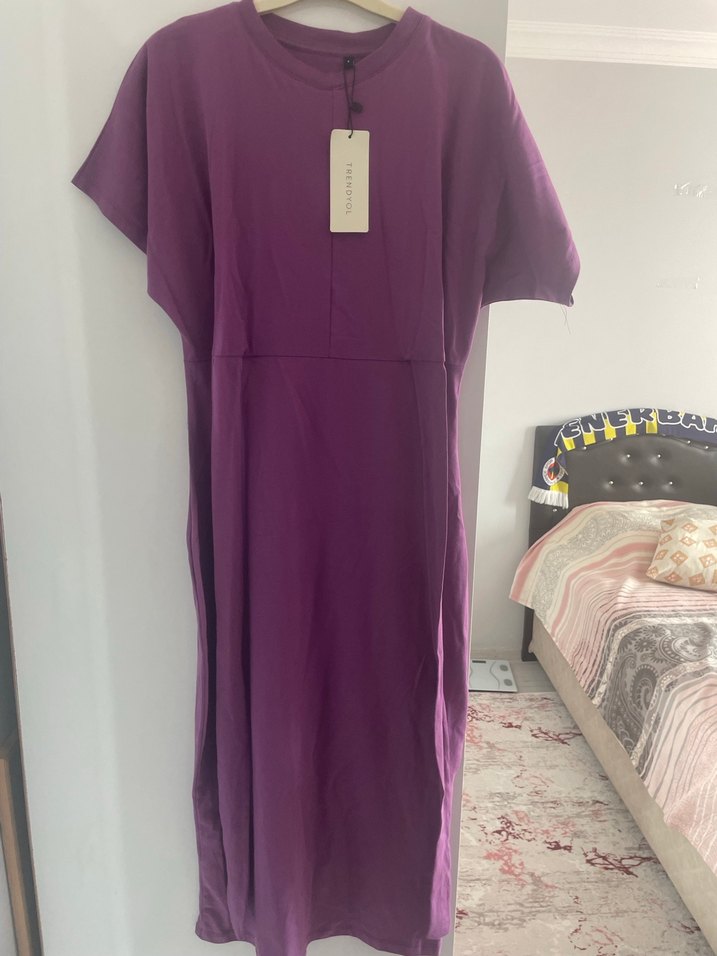 Mor renginde, uzun ve salaş kesim kadın elbisesi. Kısa kollu, yuvarlak yakalı ve ipeksi dokuda, desen içermeyen sade tasarıma sahip. Günlük kullanıma uygun.Kordonu mevcut arkadan bağlanılabilir bele oturtmak için.Yırtmacı mevcut.Hiç giyilmedi,etiketi görsellerde mevcut.Boy bilgisi için ve fiyat teklifi için yazabilirsiniz.