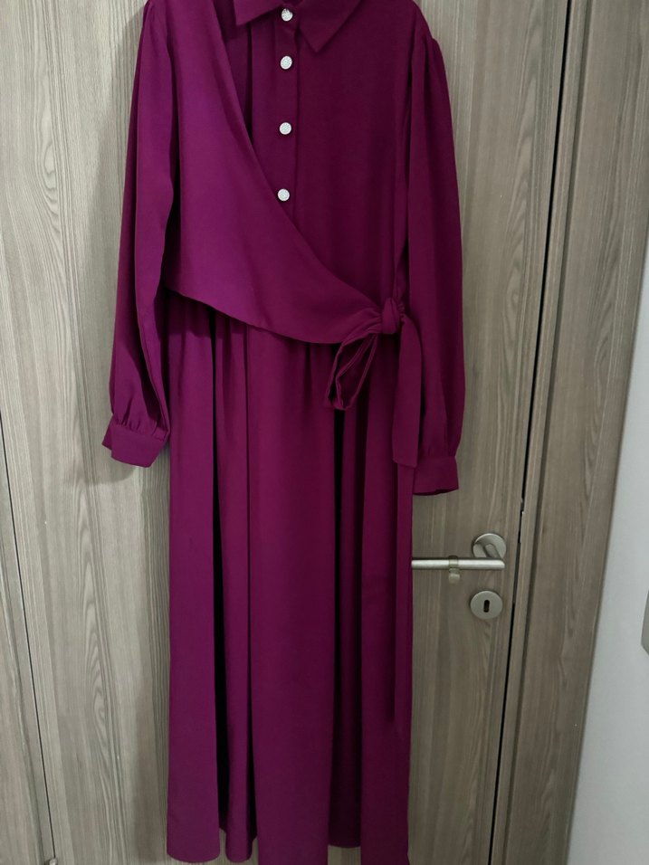 Mor renkte, uzun ve salaş kesim kadın elbise. İpek gibi dokusu, yakasında kesikli yaka ve uzun kollu. Düğmeli ve drapeli detaylar içerir, klasik ve şık bir görünüm sunar.