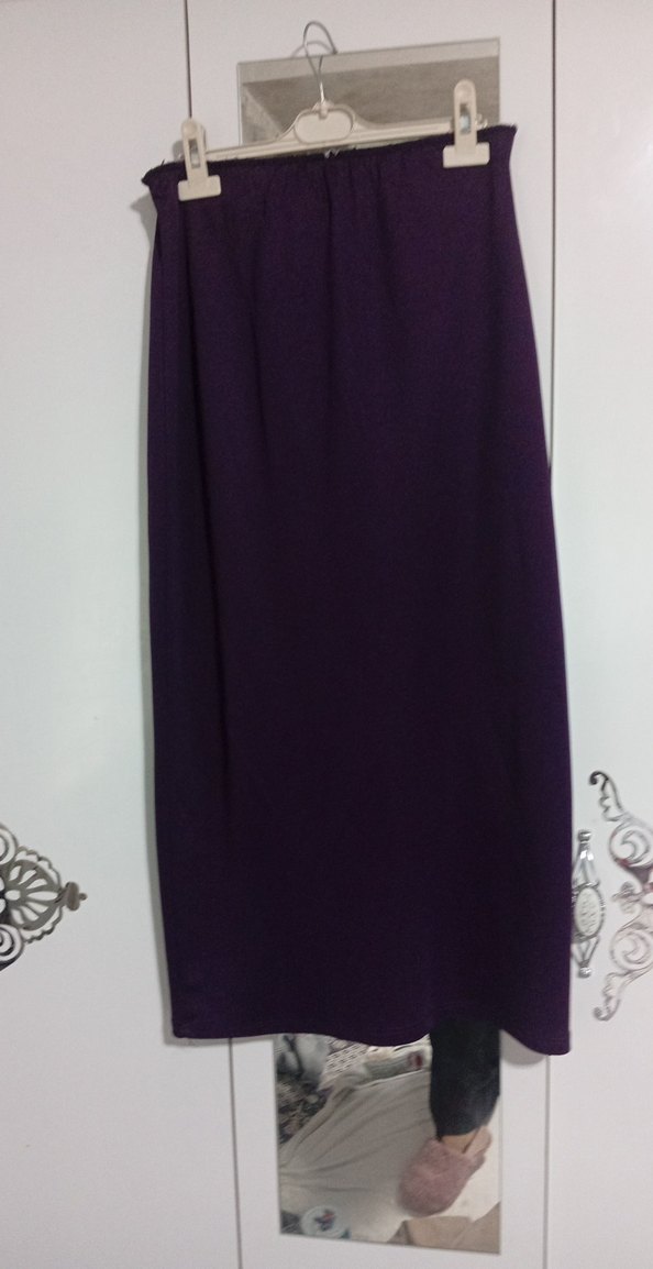 Mor uzun salaş kadın eteği, drapeli tasarımı ve yumuşak, sıcak kumaşıyla minimalist gotik stile uygundur.