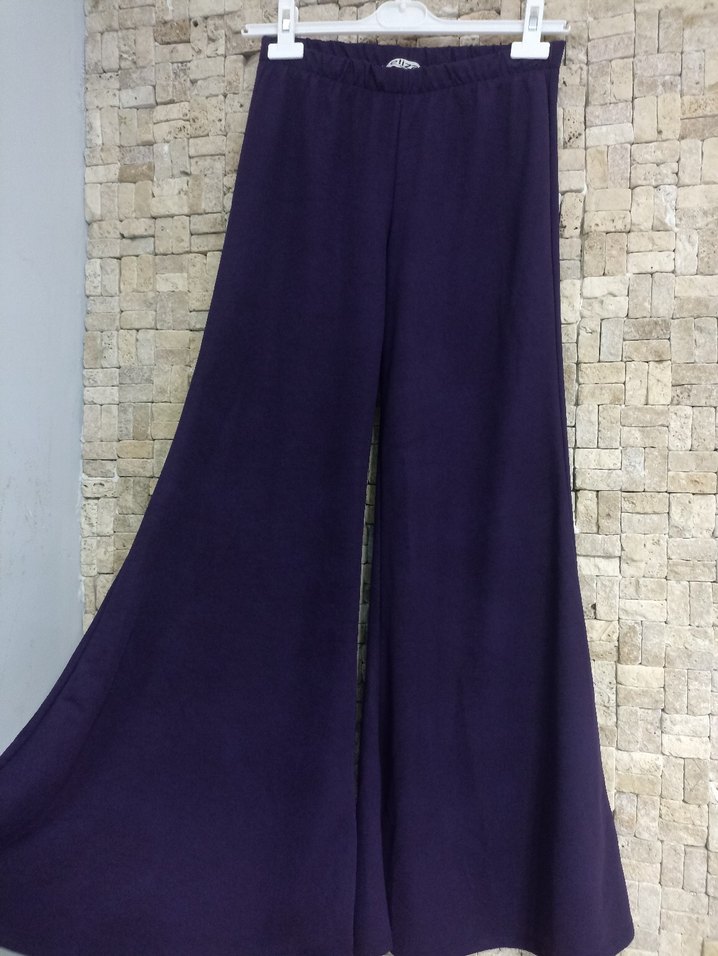 Mor renkte, uzun boy, salaş kesim ve dökümlü tarzda kadın kumaş pantolon. İpek gibi yumuşak kumaştan, düğün ve minimalist bohem tarz için uygun. 44 Beden uzunluk 102 cm