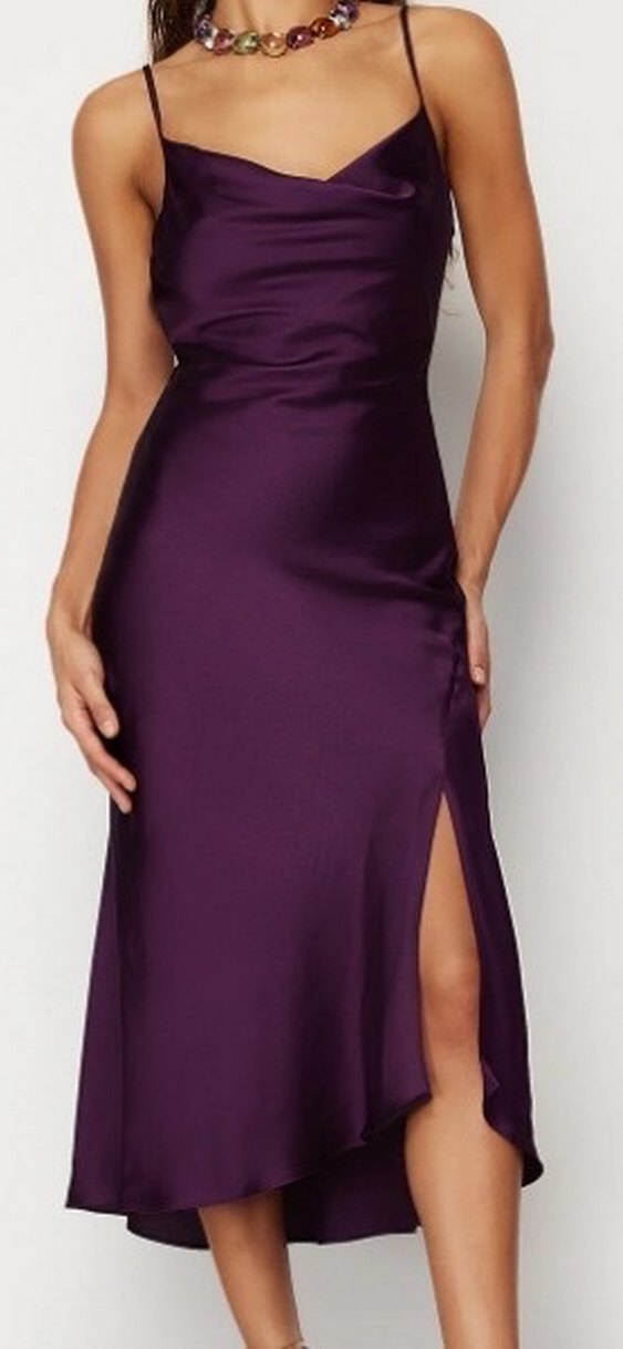 Mor renk ve saten dokulu uzun elbise. Dökümlü yaka ve ince askılı, vücuda oturan kesimiyle şık akşamlar için uygundur. Parlak ve desensiz, yırtmaç detaylı. Abiye ve mezuniyet elbisesi olabilir.