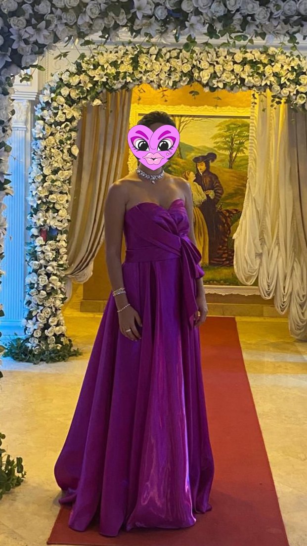 Uzun mor abiye elbise, straplez yakalı ve drapeli detaylara sahiptir. İnce kesimi ve koyu tonlu batik deseniyle düğünler ve avangard tarz için uygundur.