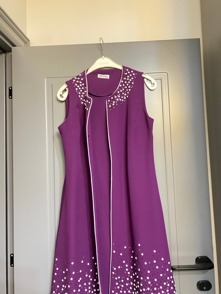 Mor uzun tunik, askısız ve drapeli tasarımıyla inci işlemeli detaylara sahiptir. Bol kesimi ve bohem stili rahatlık sunar.