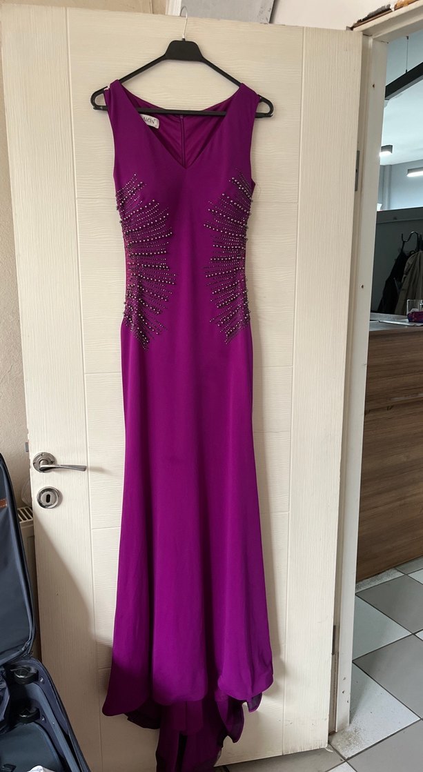 Mor Uzun V Yaka Drapeli Abiye Elbise