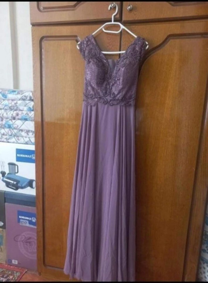 Mor uzun abiye elbise, V yaka ve kolsuz tasarıma sahip. Drapeli detayları ve dantel işlemeli üst kısmıyla modern klasik ve vintage tarzları bir araya getirir. Beden küçültüldü. XS BEDEN oldu