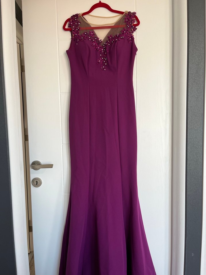 Mor Uzun V Yaka Drapeli Abiye Elbise
