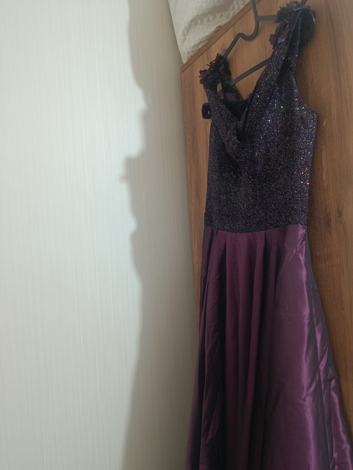 Bu mor uzun abiye elbise, drapeli tasarımı ve V yakasıyla dikkat çeker. Kolsuz ve fit kesimdir, gotik ve avangart tarzlar için uygundur. ✨