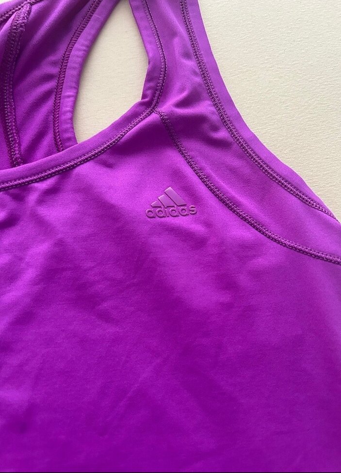 Mor renkli, V yakalı ve kolsuz Adidas spor atleti, düz , spor ve günlük kullanıma uygun.