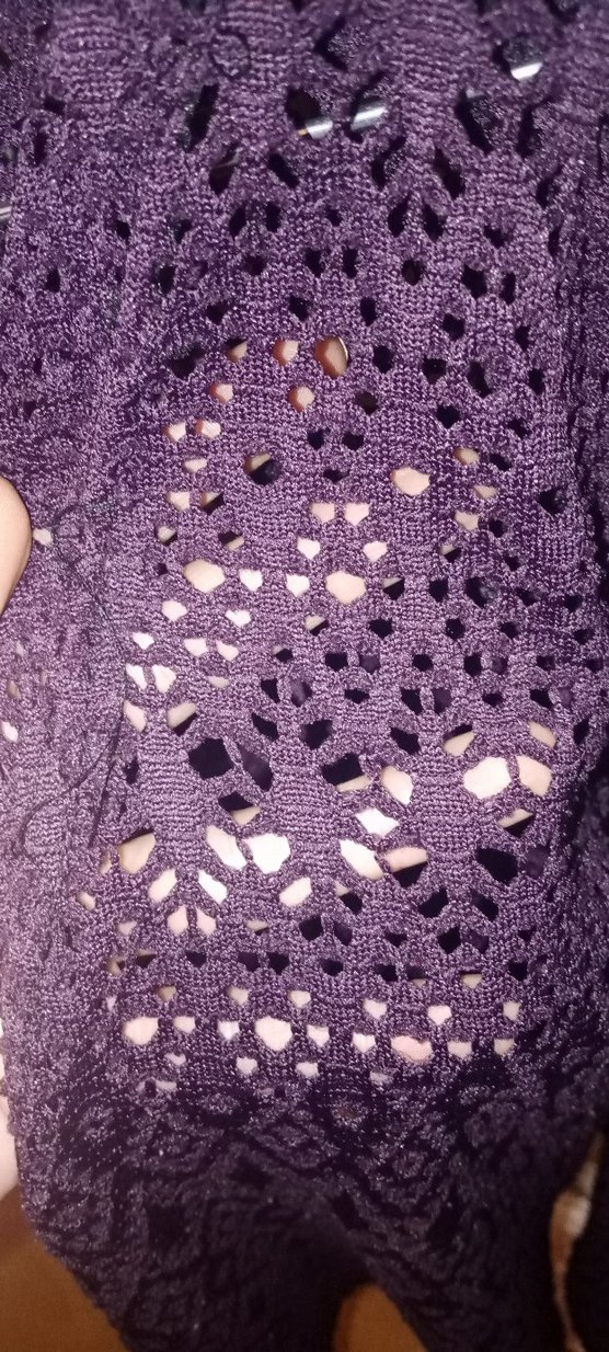 Mor renkli, V yakalı, dantel desenli örgü kazak. Uzun kollu ve bol kesim, günlük kullanıma uygun gotik tarzda.