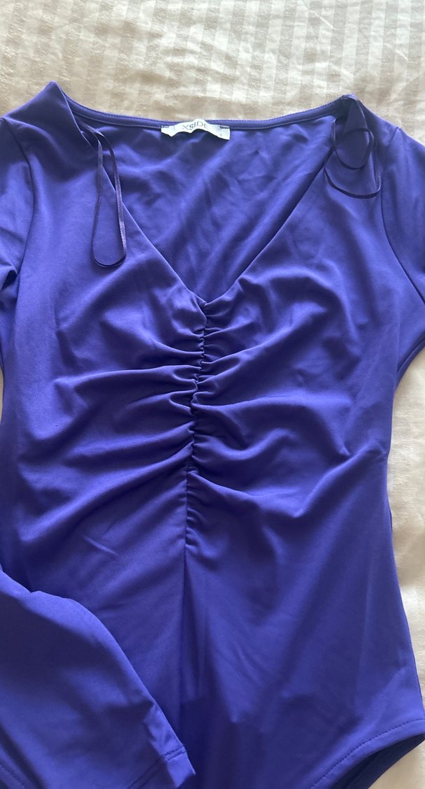 V yakalı, drapeli, parlak mor renkli ipeksi kumaştan, askılı kollu, normal boyda, dar kesim bluz