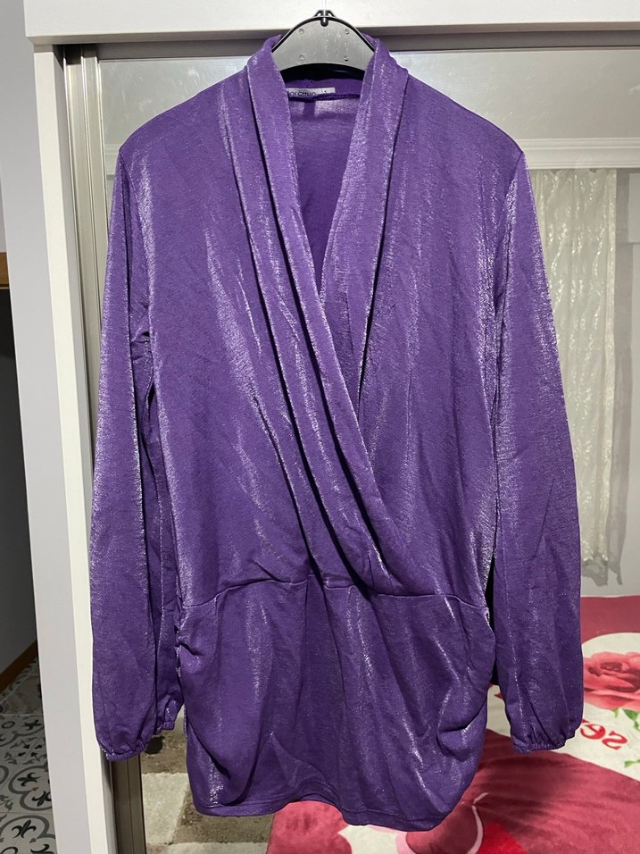Uzun kollu, v yaka bol kesim ve parlak mor renkte kadın bluz. Güncel tarzda, konforlu ve rahat bir modeldir. ️