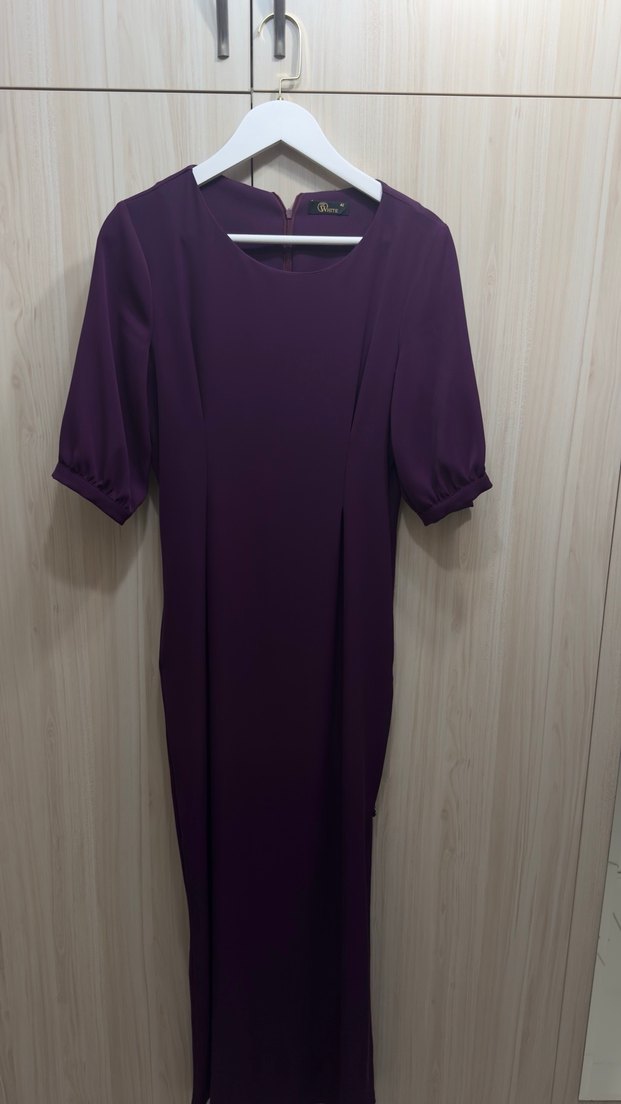 Mor renkli, V yakalı ve kısa kollu uzun elbise. Drapeli tasarımı ve regular fit kesimiyle minimalist, modern klasik stil sunar.