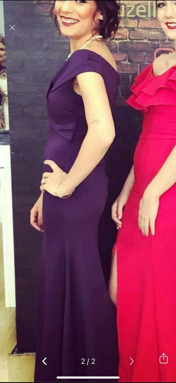 Mor renkli, V yaka ve drapeli detaylara sahip, vücuda oturan midi boy abiye elbise. İnce askılı ve şık, düğün için uygundur.