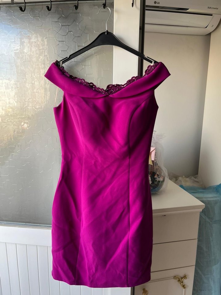 V yakalı, mor, drapeli, diz boyu ve dar kesim elbise. Klasik ve modern tarzda, romantik akşamlar için uygun. Kollu değil.