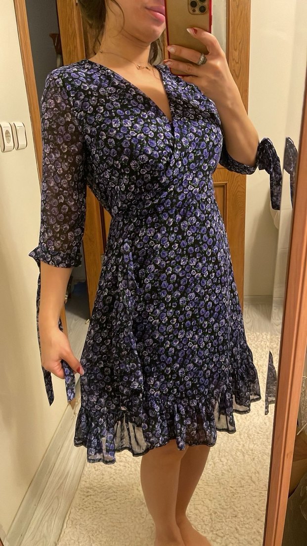 Mor renkli, V yakalı ve fırfırlı detaylara sahip, yumuşak sentetik kumaştan yapılmış, koyu tonlarda tie-dye desenli, bohem tarzda ve vücuda oturan midi elbise. Strappy kolludur, romantik akşamlar için uygundur.