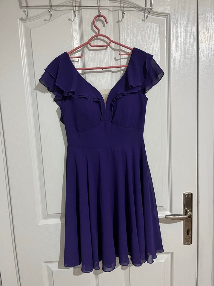 Mor renkli, V yakalı ve fırfır detaylı kolsuz midi elbise. Vücuda oturan kesimiyle düğün ve özel davetler için uygun.
