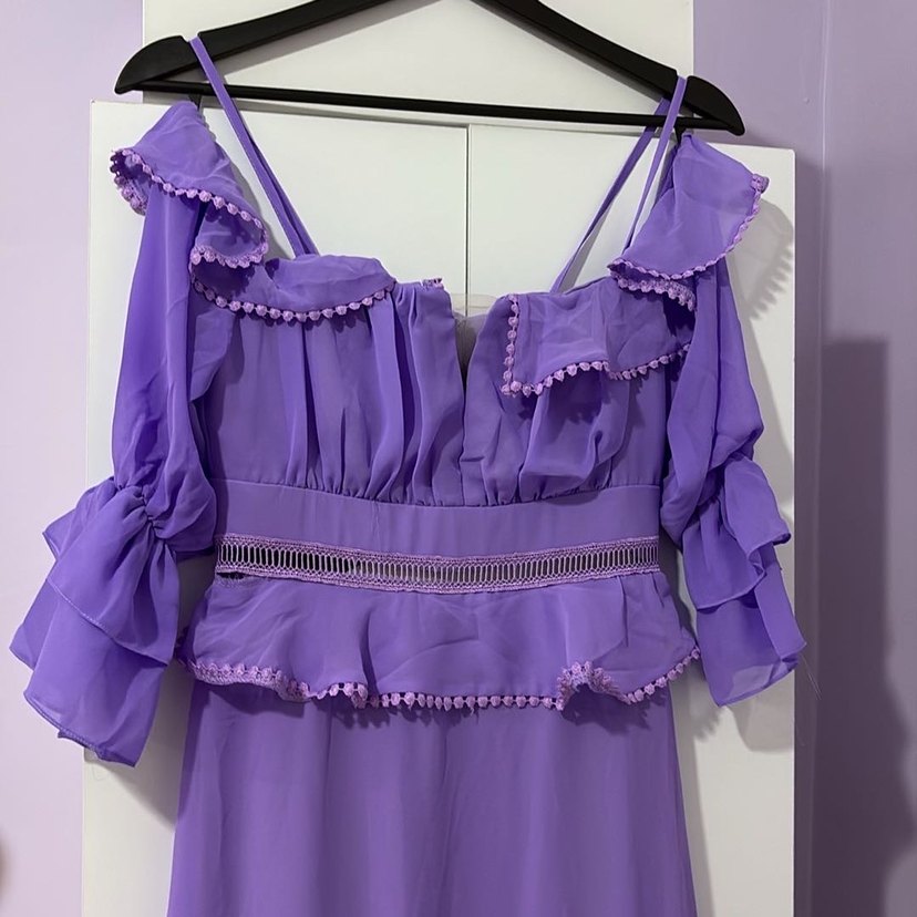 Mor V Yaka Fırfırlı Uzun Kadın Elbise