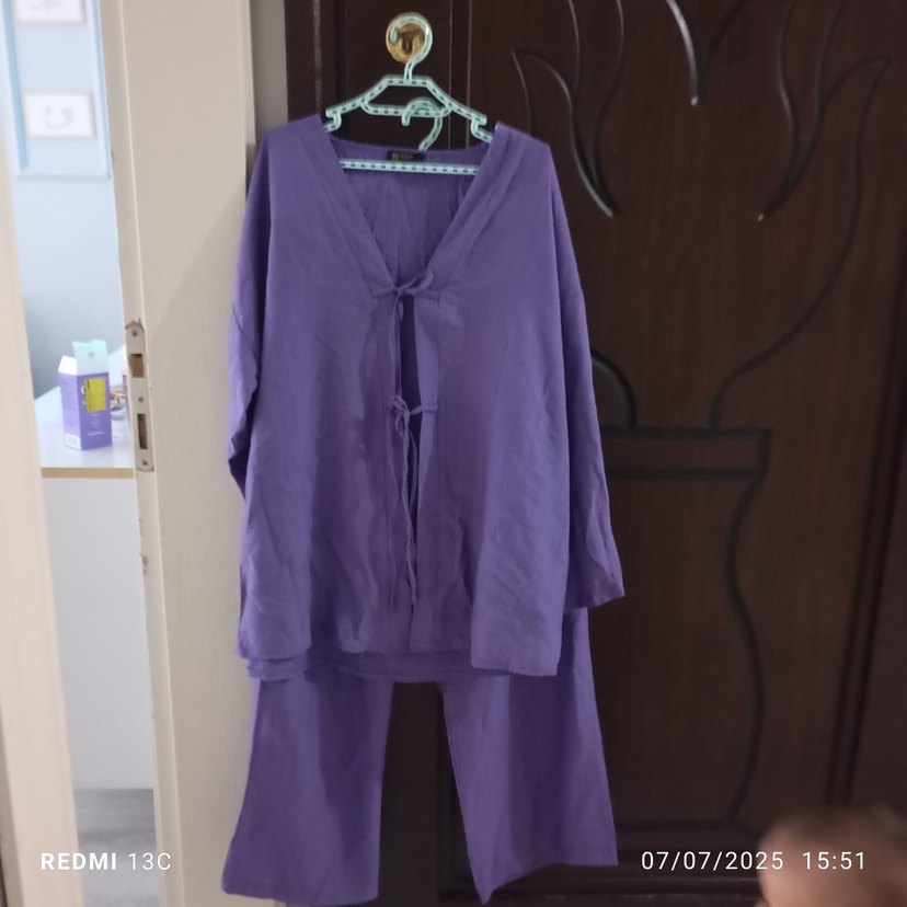 Mor pastel renk, uzun kollu, V yakalı, midi boy, bol kesim hamile ve emzirme pijama takımı.
