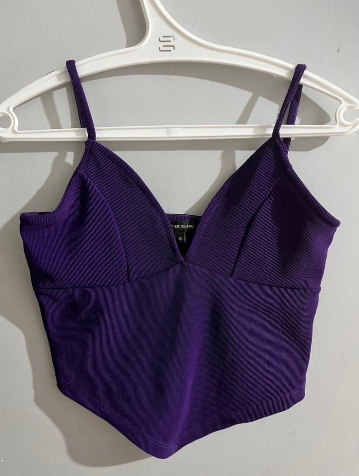 İnce askılı, V yakalı ve fitted kesime sahip mor crop top. İpeksi kumaştan, minimalist goth tarzında, günlük kullanıma uygun şık bir parça.