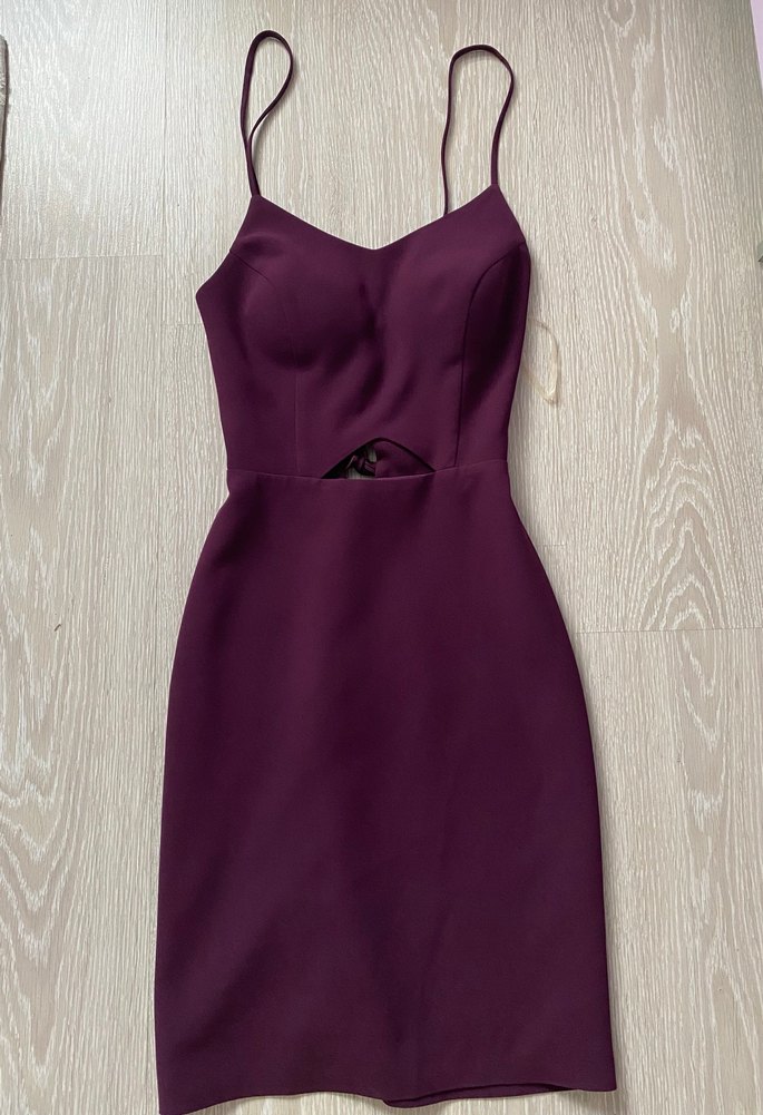 Mor renkli, v yaka, ince askılı bu dar kesim midi elbise, cesur ve minimalist gotik tarzıyla romantik akşamlar için uygundur.